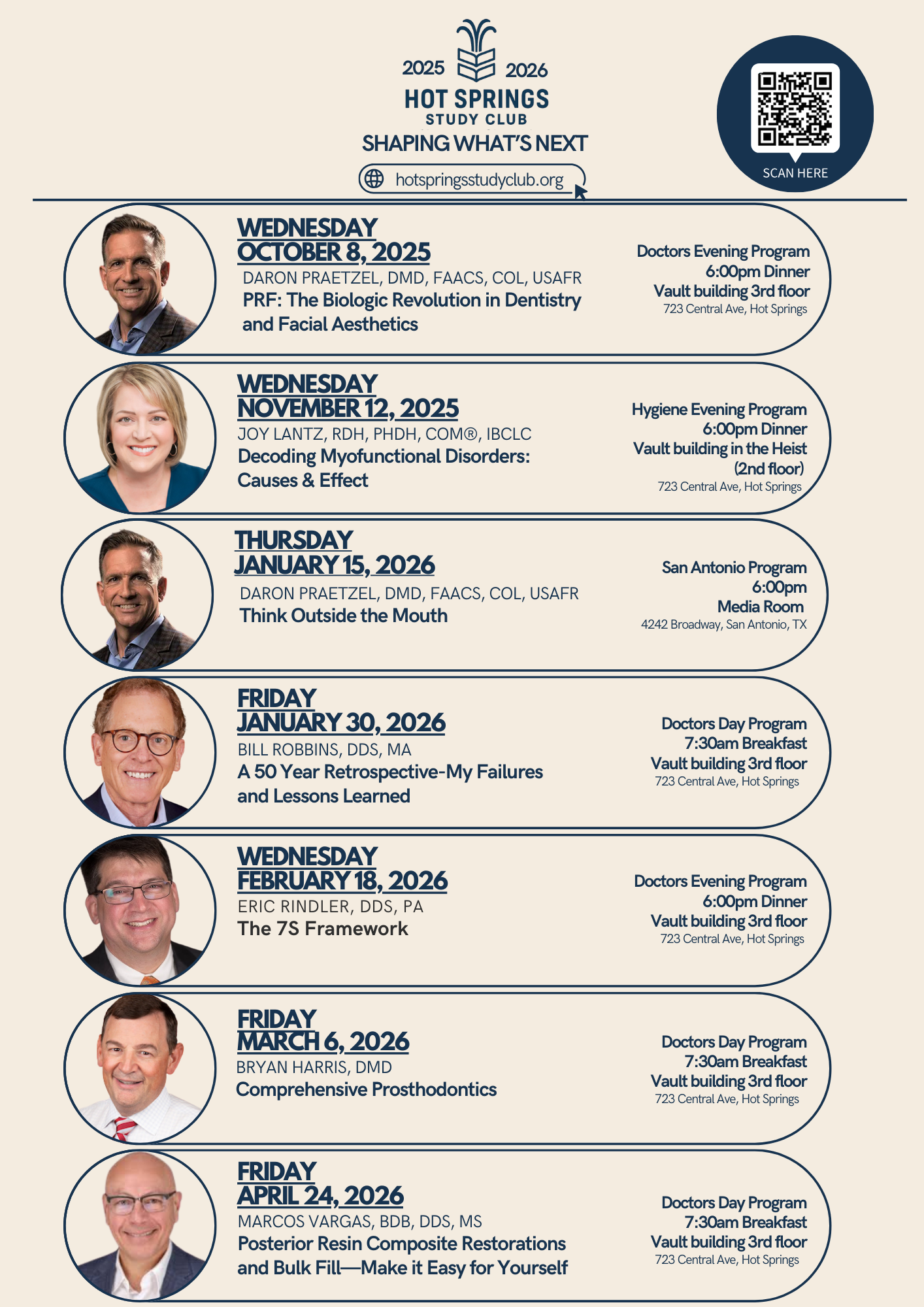 Founded in January 2011 by Dr. Daron Praetzel, the Hot Springs Study Club is dedicated to advancing education and collaboration within the dental community. Under Dr. Praetzel’s leadership as founder and director, the club provides high-quality continuing education for local dentists, specialists, hygienists, and their teams.